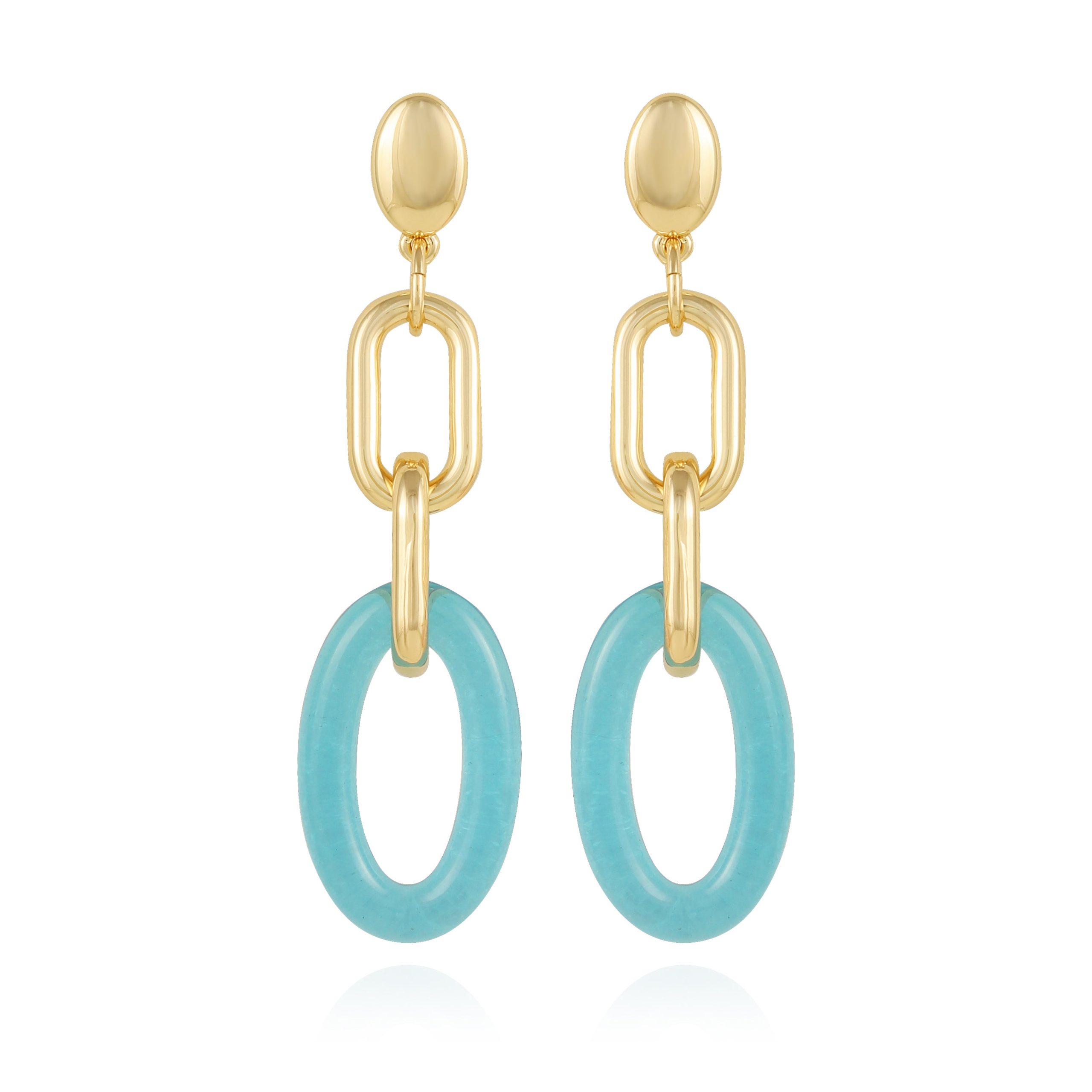 A chic pair of link drop dangle earrings featuring candy blue drops for a touch of playfulness and color to your outfit.