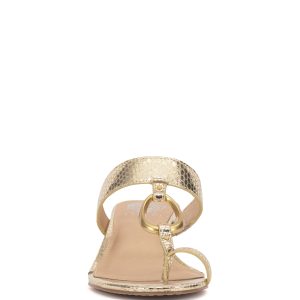 Perfect to pair with tailored trousers or flowing dresses. the Kimena sandal adds modern class to your wardrobe. The sleek gold-toned ring accent leads the eye to the trendy toe loop and covered kitten heel for a pair that looks elegant from every angle.