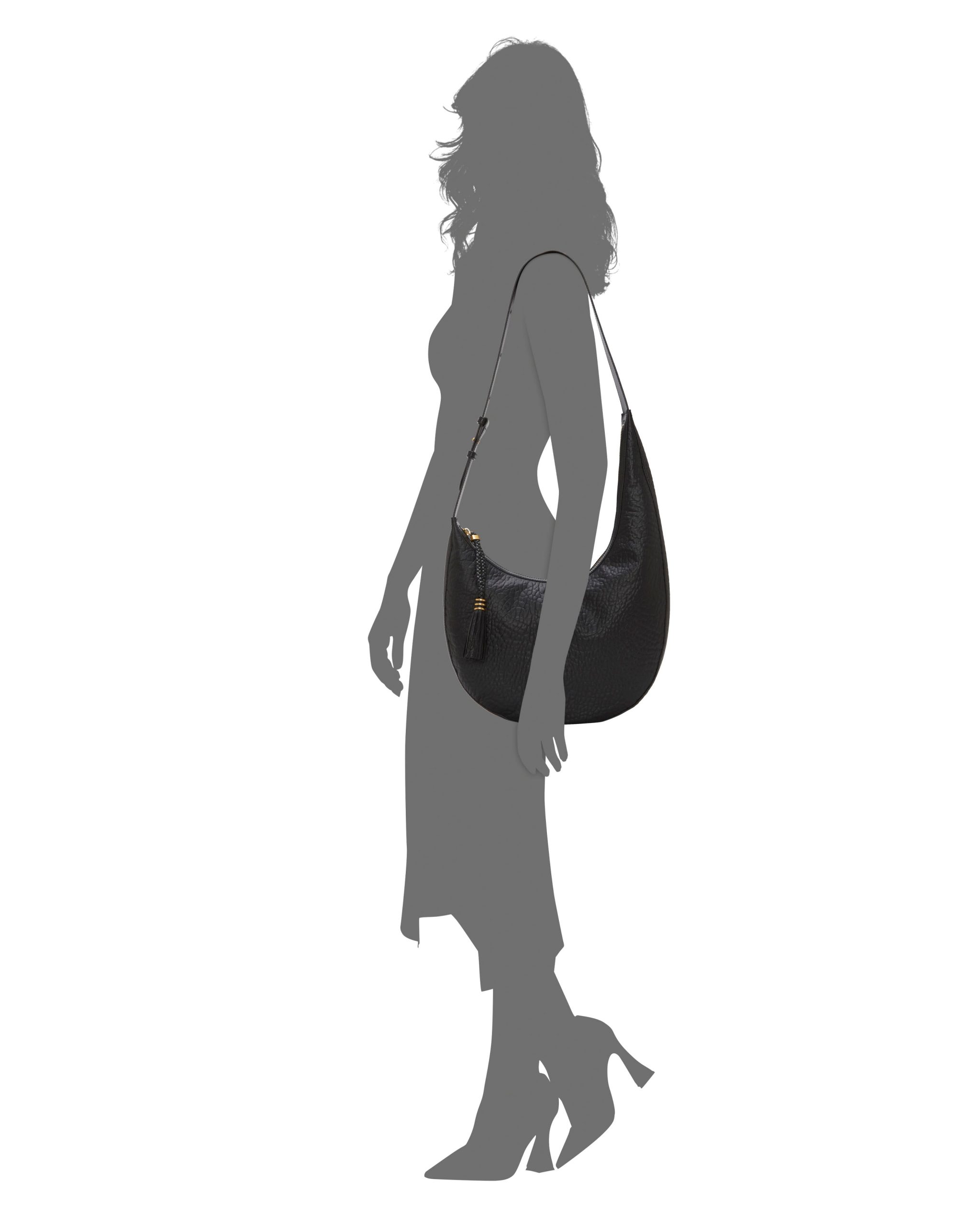 Crafted with a smooth and supple leather material. the River hobo bag from Vince Camuto elevates your everyday style with ease. The crescent-shaped design and fringe detail adds fresh touches to a simple silhouette. while the adjustable handle and durable leather material makes it practical.