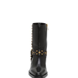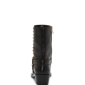 Embellished with gold-toned studs and a harness accent. the Roista moto bootie brings bold. edgy style to any outfit. The low block heel adds the perfect amount of lift while the tapered toe streamlines the design for a sophisticated update to the classic biker-inspired silhouette.