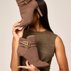 The Sahra bootie flaunts sophistication from every angle. The double gold-toned buckles pop against the smooth leather upper while the towering stiletto makes a stylish statement.